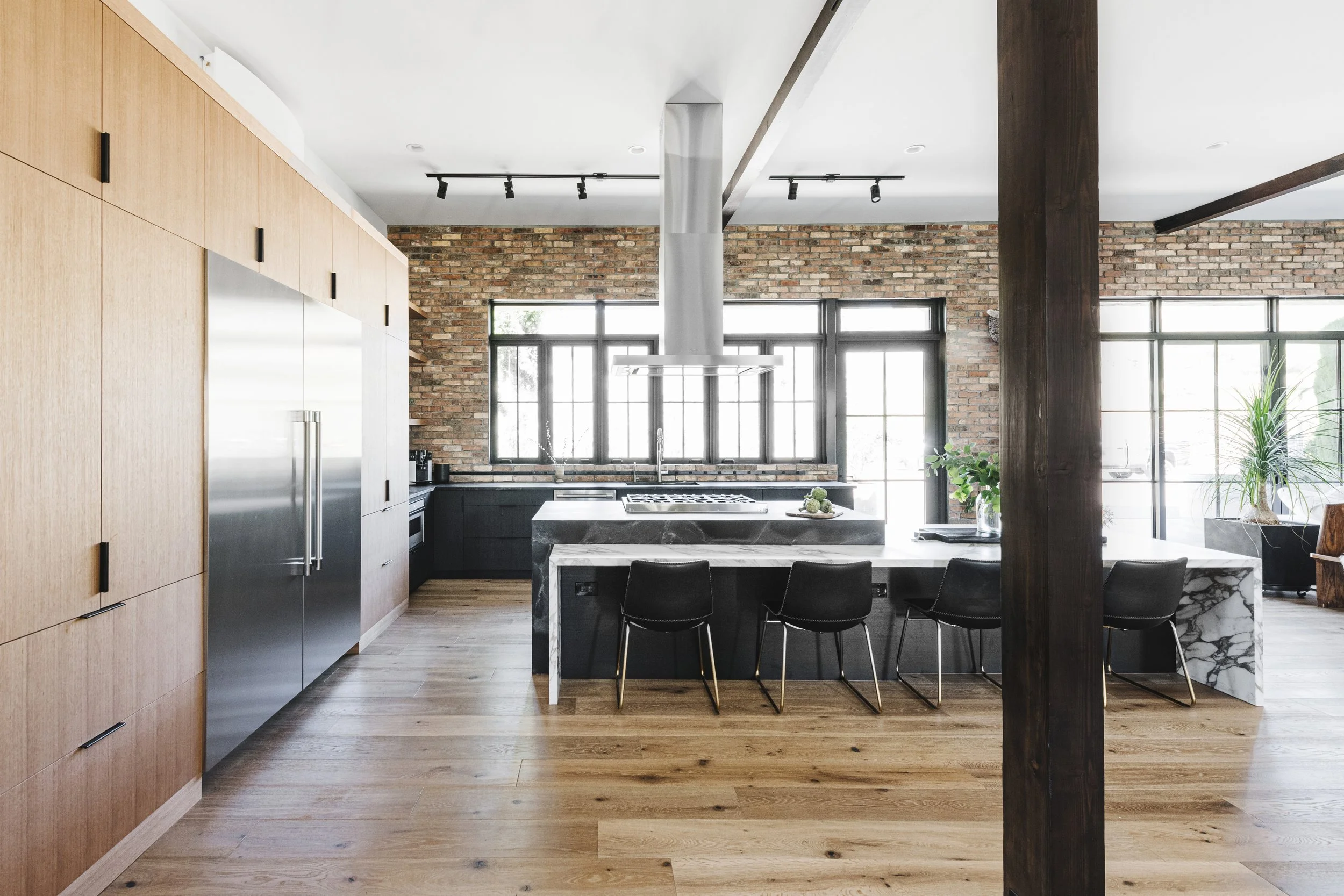 This artist’s studio was a playful way to reimagine the possibilities of a barn out in the Santa Rita Hills. Some of our favorite details include the marble countertops, reclaimed brick wall, the spiral staircase, and of course the claw foot tub.